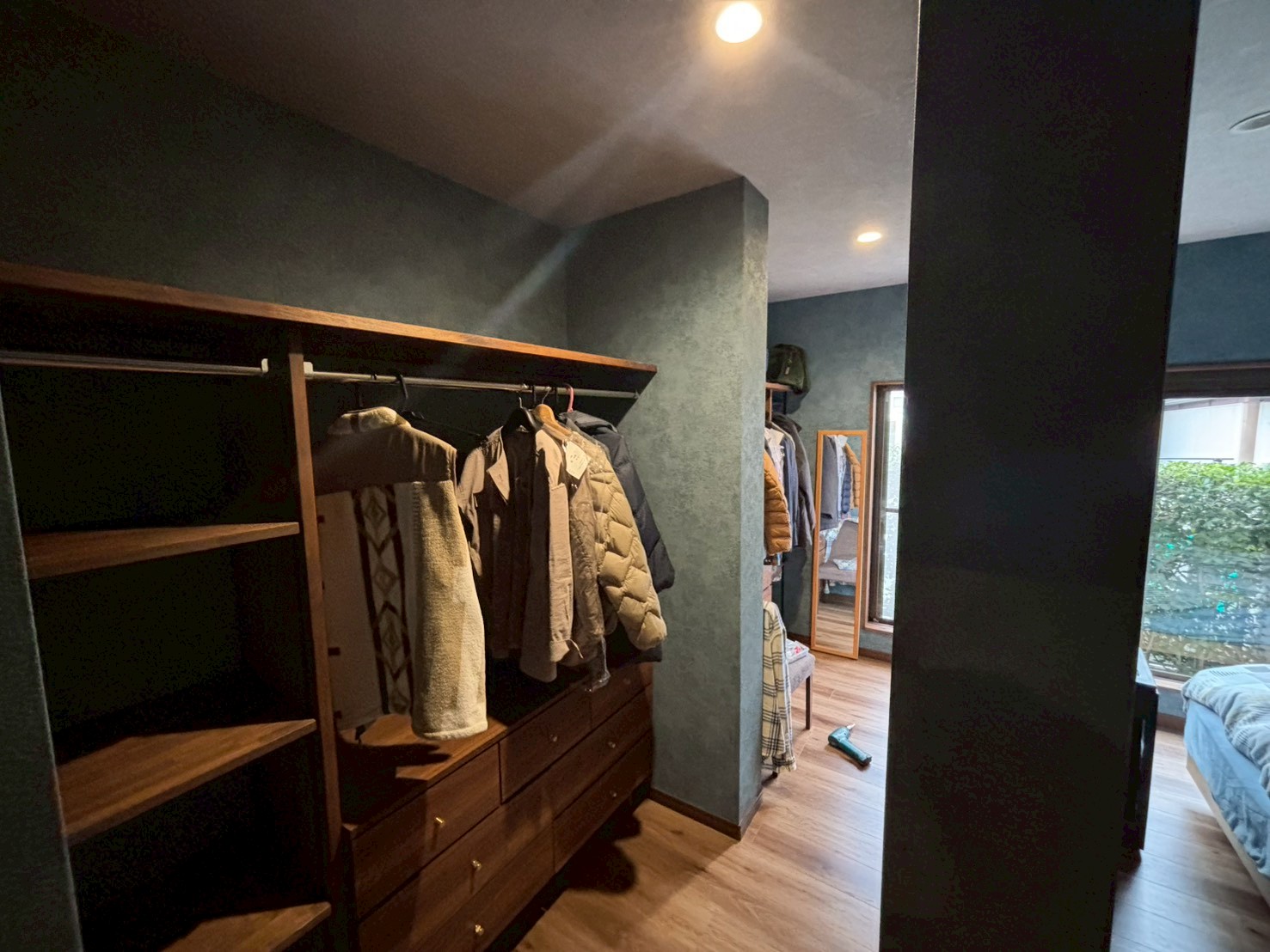 隣接していた浴室は右隣に移動させ、元々あった浴室2.3帖と合わせて5帖の洗面脱衣室が完成。洗面化粧台ファミーユは幅1000㎜で引き出し収納たっぷり。奥のランドリースペースに物干しパイプとチェスト。洗う・干す・しまうがこの部屋だけで完結します。