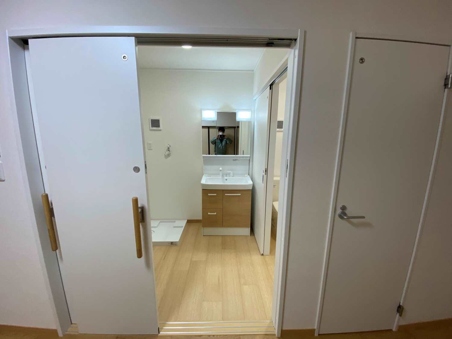 左側の取っ手付きの白い扉を開けると、水回りスペース