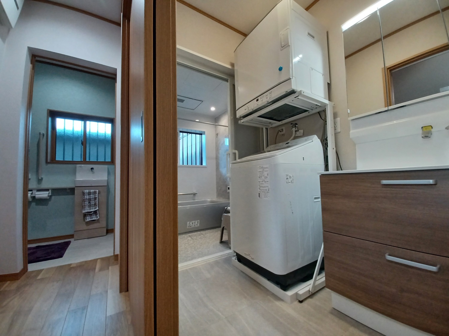 左側奥に移っているのがトイレ。右側が洗面室で、その奥がお風呂です。ドア一つで移動できるから便利ですね。ドアではなくて引き戸にしたことで、省スペースだし、安全面でも効果ありです。