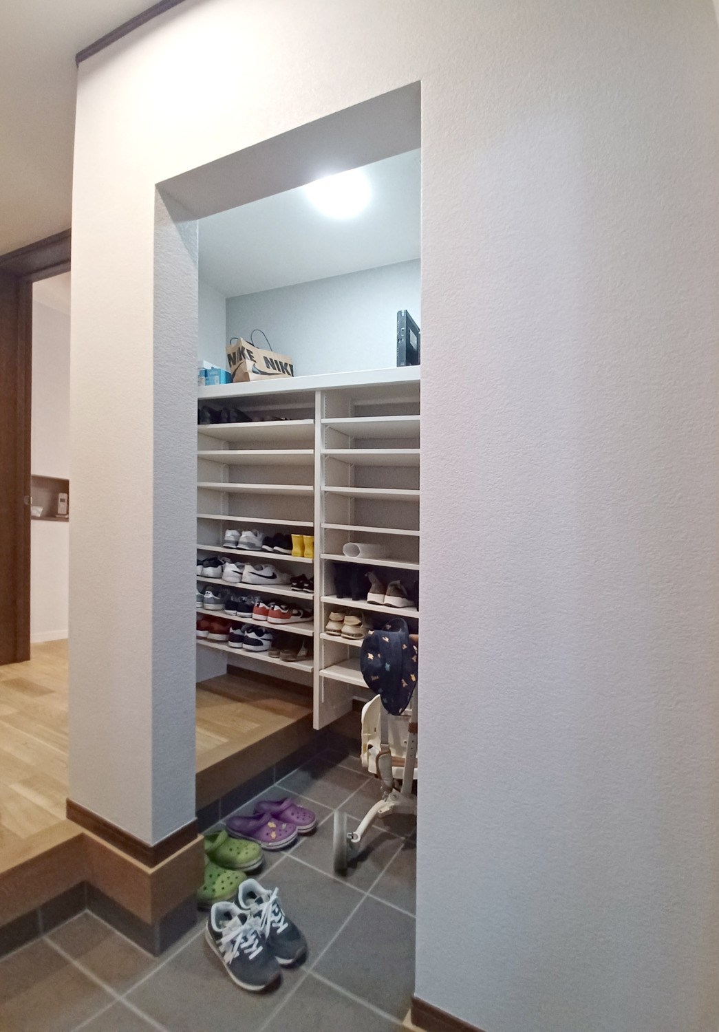 玄関横に大きな靴箱をやめ、靴を履いたまま入れるシューズクロークを新設しました。玄関タイルと続くためベビーカーや三輪車もそのまま置け、ご主人のゴルフバッグ専用スペースも確保。出入口にドアがないので動線がスムーズで、玄関側・室内側どちらからも直接行けます。靴の収納や目隠しにも便利で、子育てにも大活躍です。