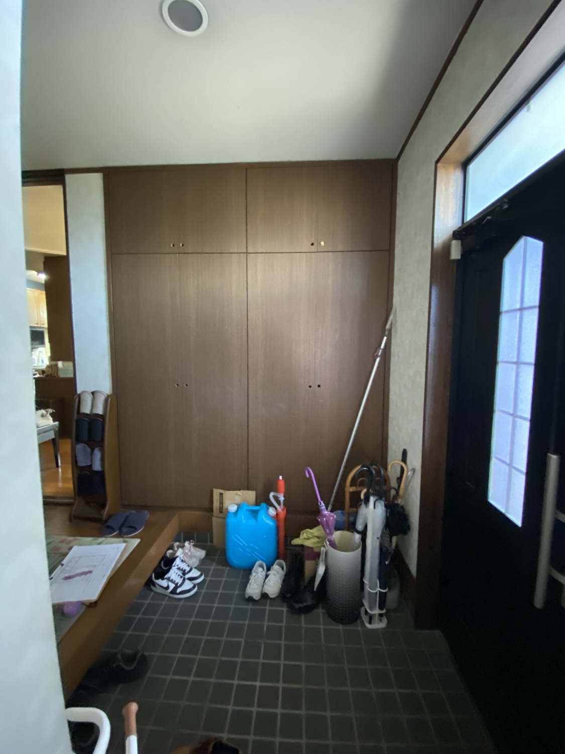 大きな扉付きの作り付けの靴箱。天袋のドアは奥様の手も目も届かないのでほとんど使っていないそうです。収納しきれない物があふれてしまっています。