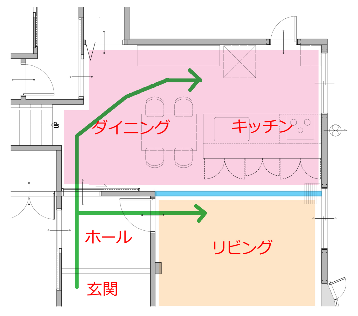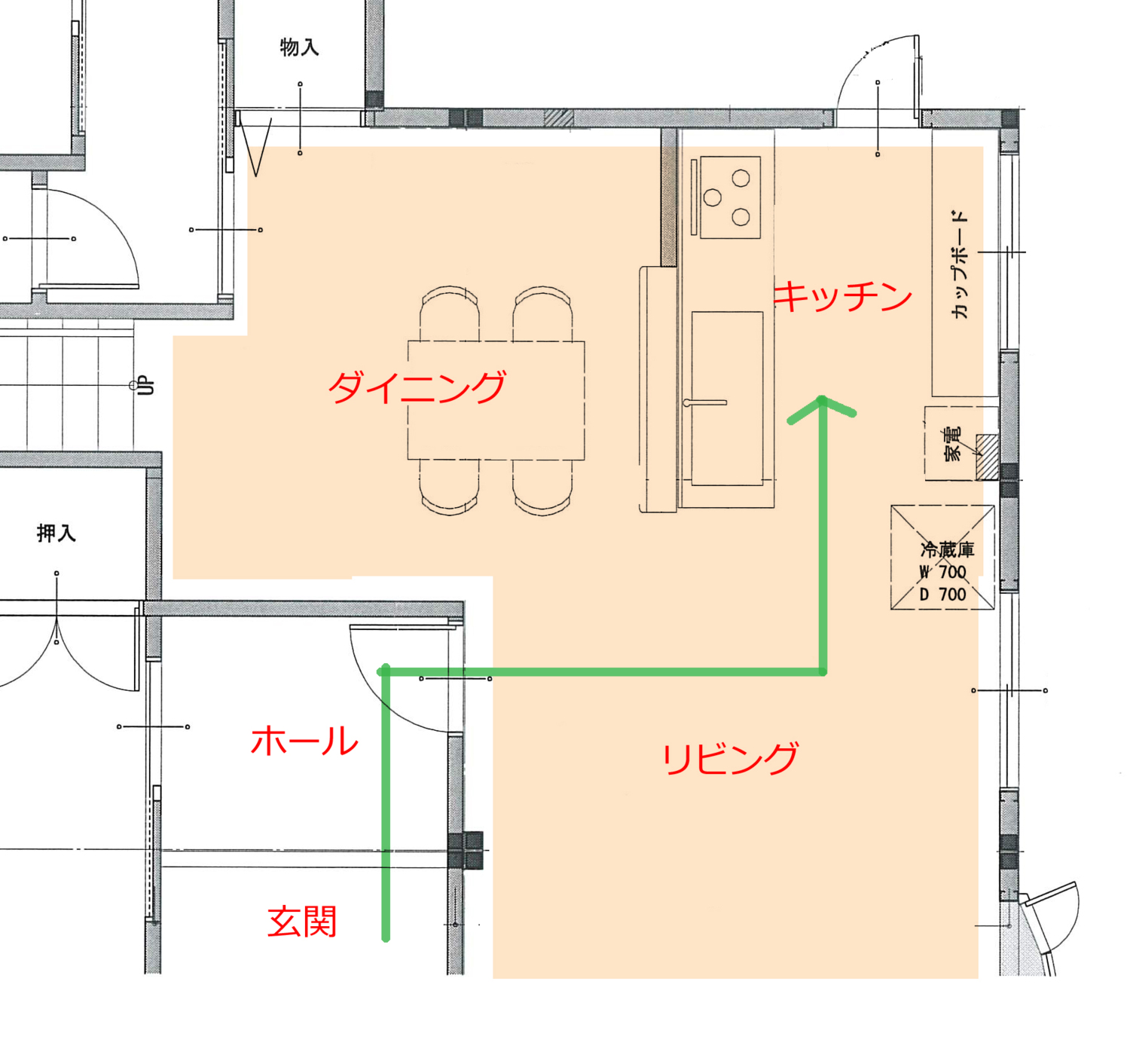 玄関からホール、いったんリビングを通ってからキッチンへ行く動線でした。子供さんたちが階段で2階に上がる前に必ずリビングを通らなくてはならない。そんなファミリー向けの間取りでした。
