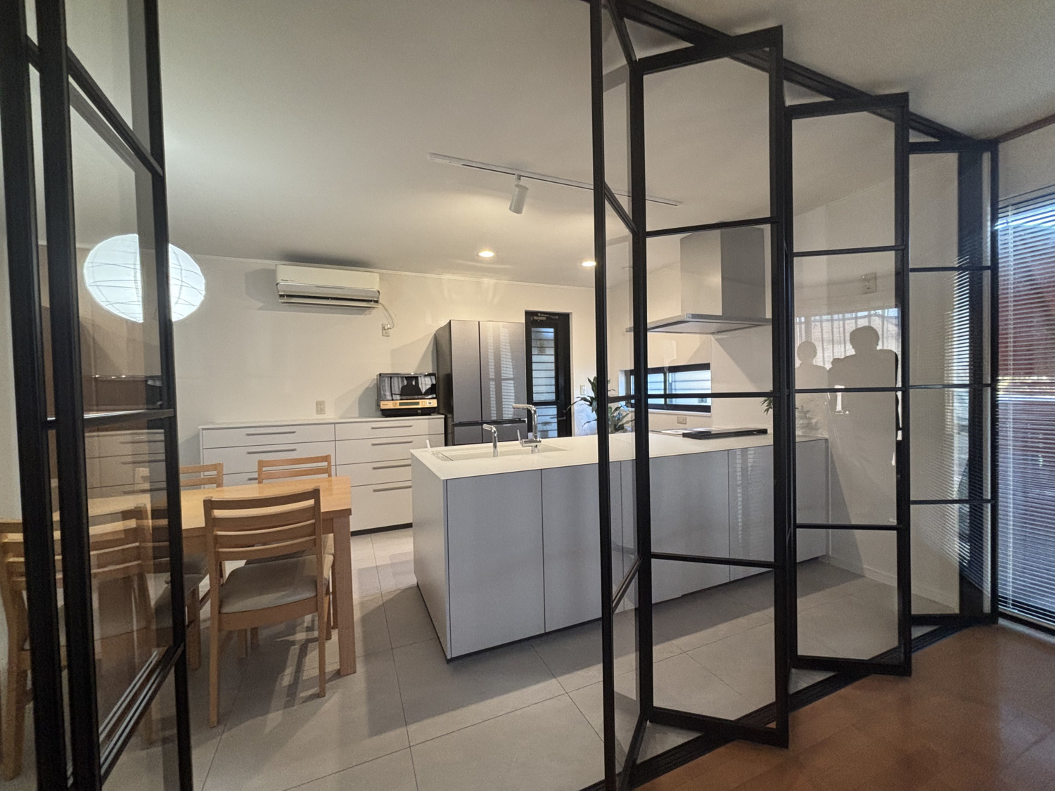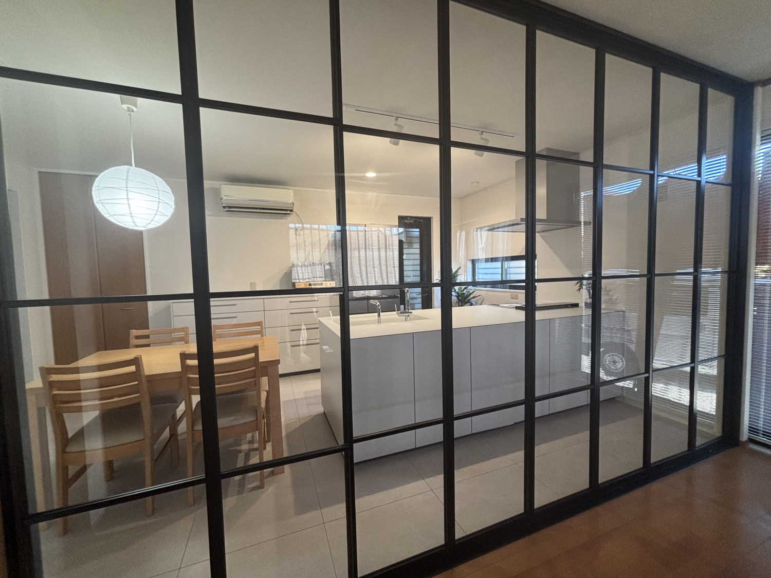 ダイニングキッチンとリビングの間を、開閉自在な透明なパーテーションで仕切りました。