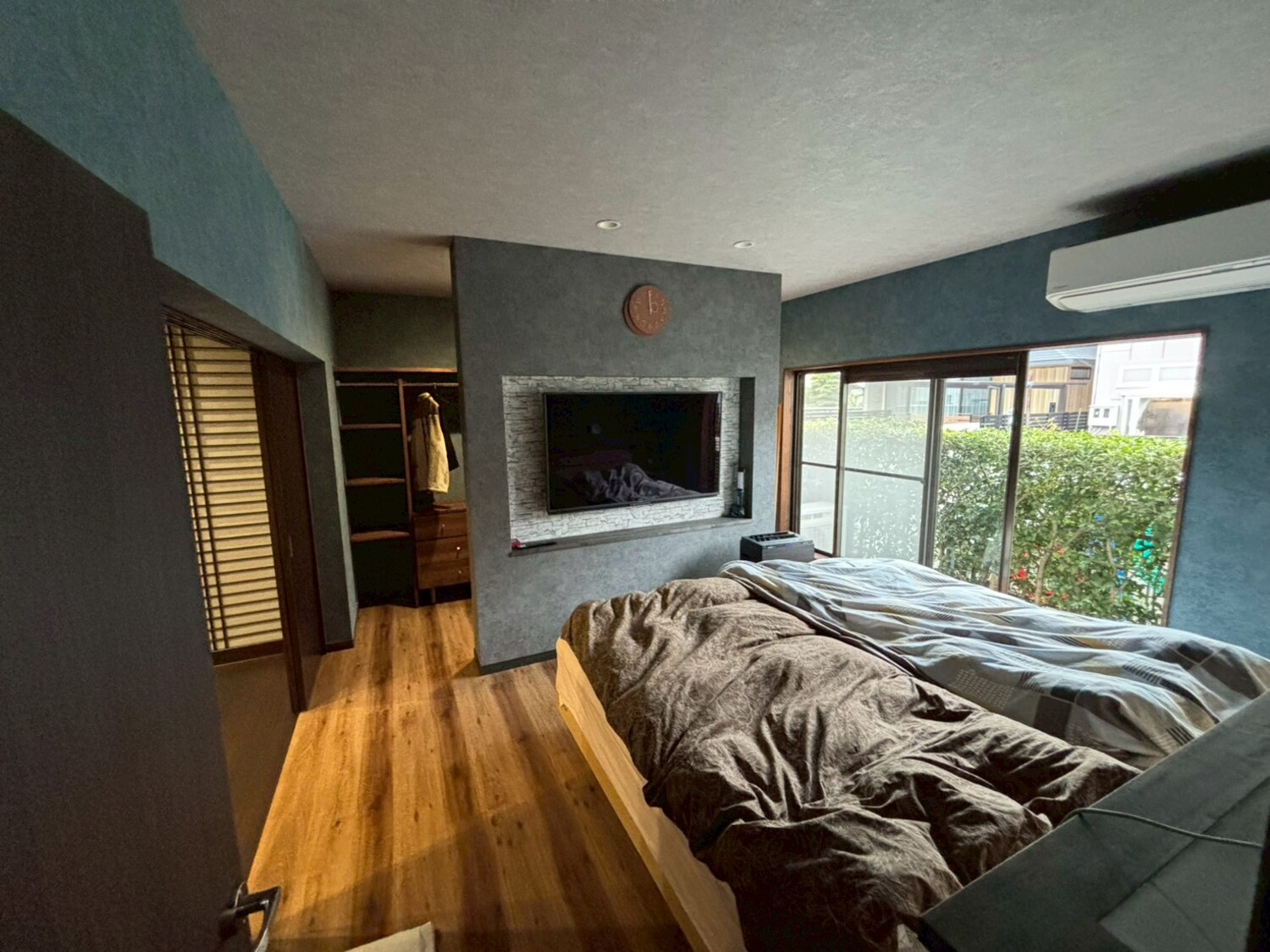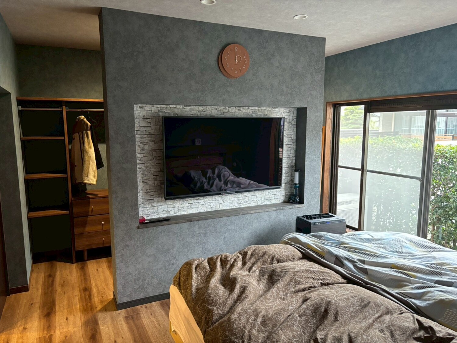 もとは和室の押し入れがあった場所です。一間(180㎝)の壁を新しく建て、テレビを設置。ベッドで休みながらゆったりテレビが見える場所です。