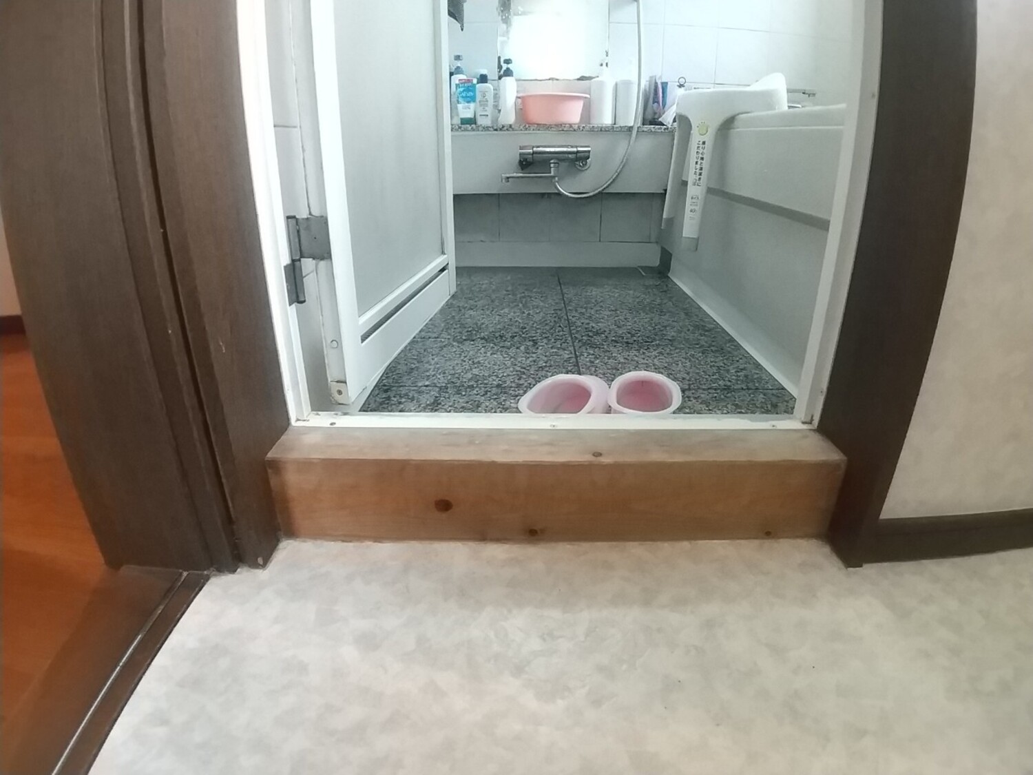 廊下から引き戸を開けて洗面脱衣室、ユニットバスまで、段差なくフラットな床でスムーズにつながりました。