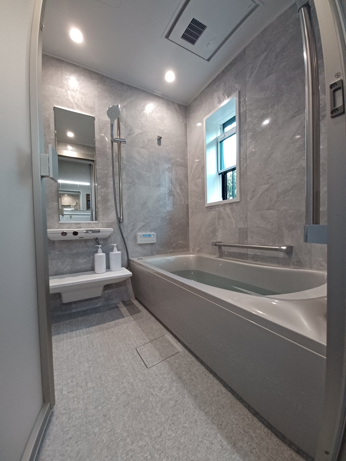 ●快適性と清掃性を両立した浴室 選ばれたのはTOTOの最高級システムバス「シンラ」。ほっカラリ床で足裏がやわらかく、乾きも早いため掃除が驚くほどラクに。壁は水はけが良く、一拭きで水気が取れるつるつる仕上げ。奥様が長年感じていた「掃除のストレス」を根本から解消しました。