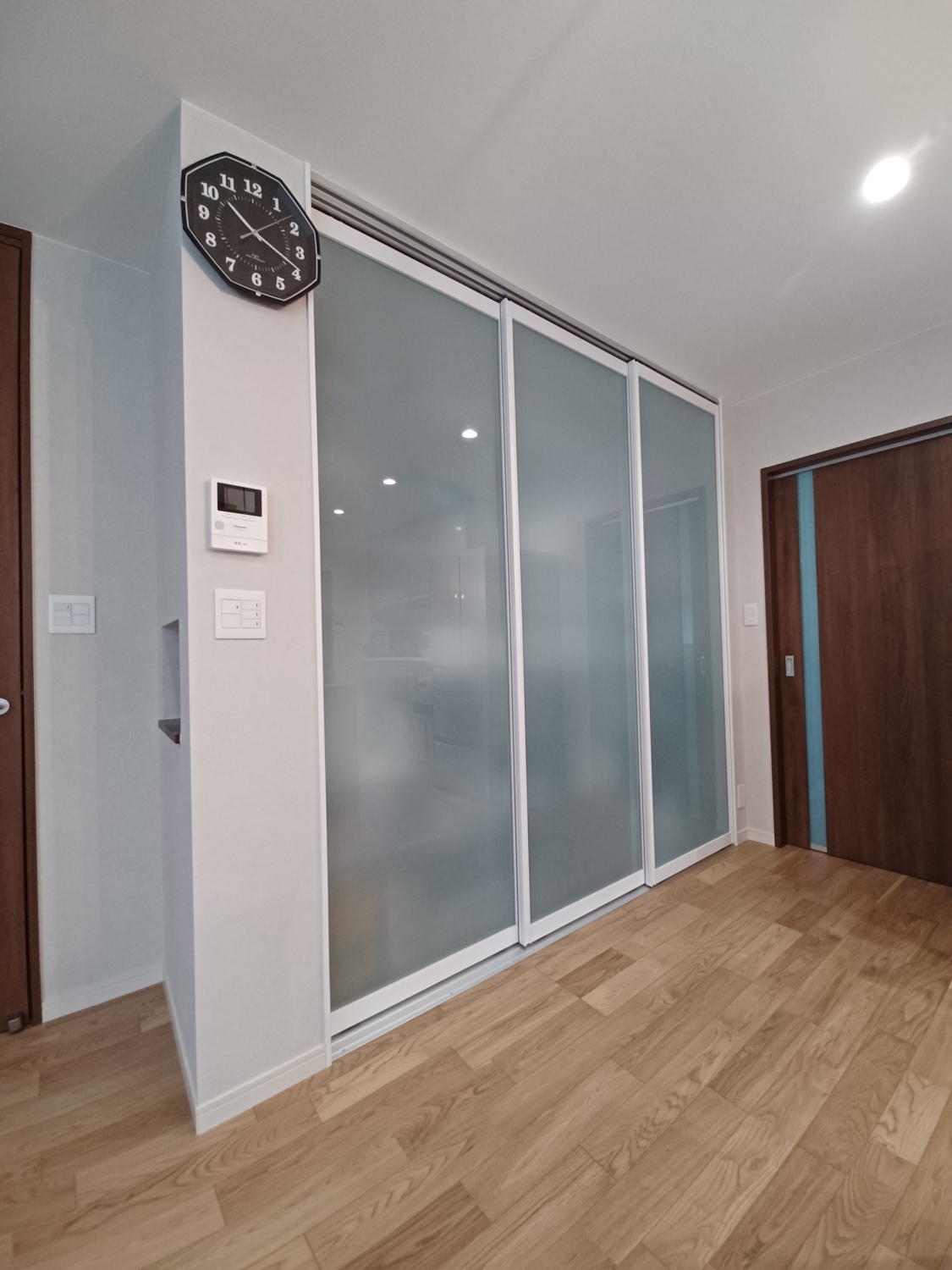 右側に少し見えるのがキッチンのシンク。キッチンは壁を向いています。左側の大きな食器棚の向こうにダイニングとリビングがありますが、完全に遮断されています。姿はおろか、子供さんの声すらここまで届きません。