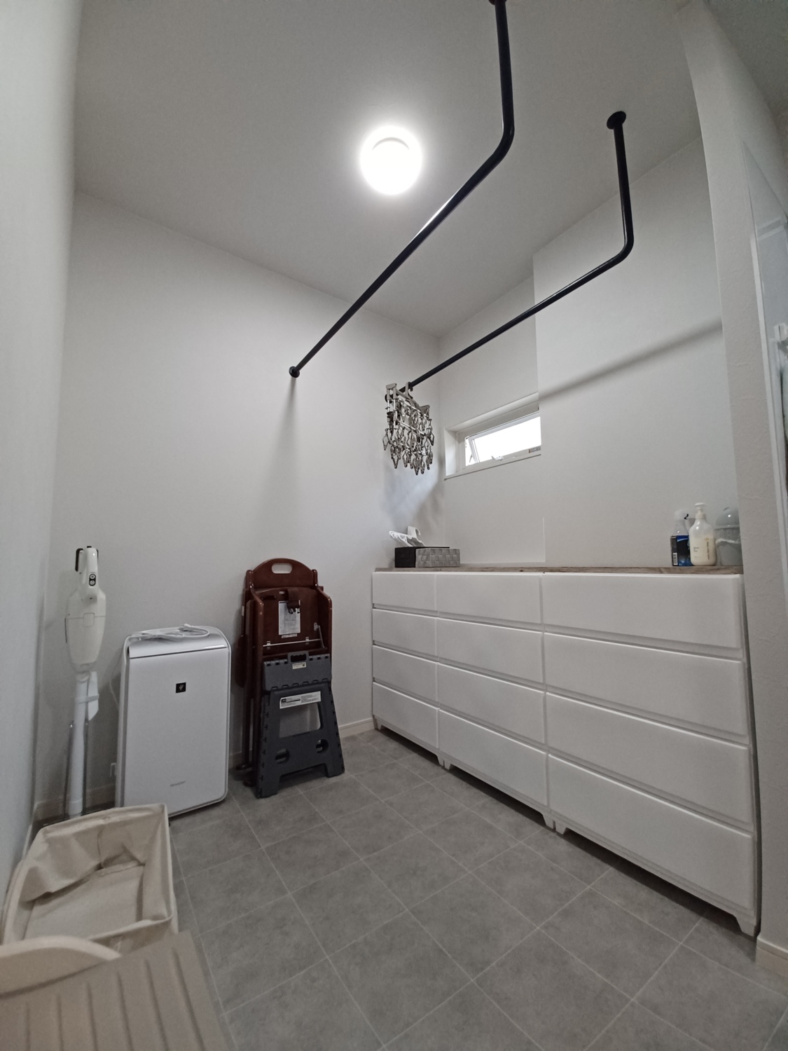 脱衣室とひと続きの5帖の洗面脱衣室になり、浴室だった場所はランドリースペースになりました。2本のランドリーパイプには、バスタオルやしわになりたくない洋服をかけて乾かすそうです。床は水に強いクッションフロア。柔らかいので小さな子供さんにも安心です。乾いた洗濯物をすぐにチェストにしまえるので、家事の時短になりました。